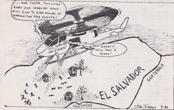 This cartoon by Jirous appeared in several local newsletters and his work inspired many on the realities of US Policy in Central America, along with the human cost of those counter-insurgency wars.