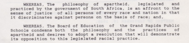 The efforts of the local anti-Apartheid group certainly paid off, since the Grand Rapids Public School Board voted 7 – 2 in favor of condemning South African Apartheid. Here is part of that resolution, which emphatically condemns racial apartheid.