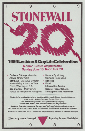 For example, there is this powerful video of a Network event in 1992 billed as a discussion about the lessons learned from Stonewall. In this video (embedded below), Holly VanScoy and Dennis Komack facilitate this discussion which covers a whole range of topics, such as the Lesbian influence in the local movement, how Grand Rapids responded to the AIDS crisis, dealing with the reaction right in West Michigan and the evolution of Pride events.
