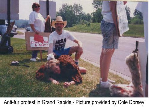There was also direct action going on at that time that was not sanctioned by WMFA or undertaken by any “organized” group. I know that roadkill was delivered to the steps of fur stores and that fur coats were damaged on the racks of their stores. I know that “blood” was splashed on their windows and windows were broken. I also know that more than one fur coat got splashed with “blood” while being worn in public in Grand Rapids. I believe all these actions collectively, coupled with society’s changing attitude towards fur, had a major impact on the fur industry in GR. Today I think Leigh’s in East Grand Rapids is the only store selling furs these days.