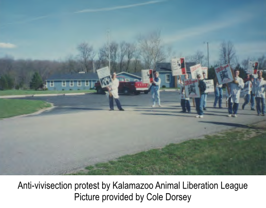 I contacted the national office of PETA and asked for contact information for local members to get involved with. They sent me a large list of animal rights groups across the Midwest. Most notable to me then and the proceeding years were WMFA and KALL (Kalamazoo Animal Liberation League). It was with these groups that I devoted much of my time for the next couple years.