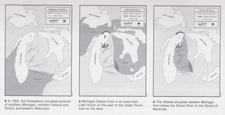 The territory that would eventually become the state of Michigan in 1837, was negotiated through a variety of treaties. (see map above). This series of treaties was signed by the US government with members of the Odawa, Ojibway, and Potawatomi nations. This map below shows the areas of land that were inhabited by the Odawa, Ojibway, and Potawatomi nations.