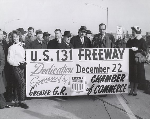 “In 1953, the state approved plans to build U.S. 131 though Grand Rapids, running the expressway west of the Grand River and avoiding the downtown business district. The new highway also helped facilitate the suburban growth. In no small way, the state and federal highway system became a driving force behind the desire to get something moving downtown.”