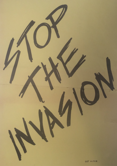 During the late l980s there were weekly protests on the issue of U.S. intervention in Central America. That was during the time that Ollie North was engaged in criminal activities that supported repressive regimes in Central America. After the picketing we often had potluck dinners where discussion of other “actions” would take place. One night Sheldon Herman, Nate Butler, Kate Byrne, Eddie Gersh, and I sat in my kitchen on Logan Street and one thing led to another and we made up a poster that looked like scrawled graffiti. The “Stop the Invasion” poster became a Campaign of the same name. The Stop the in Campaign (of Central America by the U.S.) STIC was born. We hatched a plan for street theater that we realized later could have resulted in one or more of us being shot. Four or five of us were posted in various parts of the city. Nate Butler was out at the Kalamazoo Meijer, Liz Oppewal was in a County Commission meeting, Theresa Wylie was in the GRCC Student Commons and I was standing in front of the Amway Grand Plaza Hotel. Each of us was kidnapped by a group of our cohorts dressed green fatigues and black berets or with scarves covering their faces. They represented government troops in Central America. The screeched to a stop and piled out of an old VW van, we had