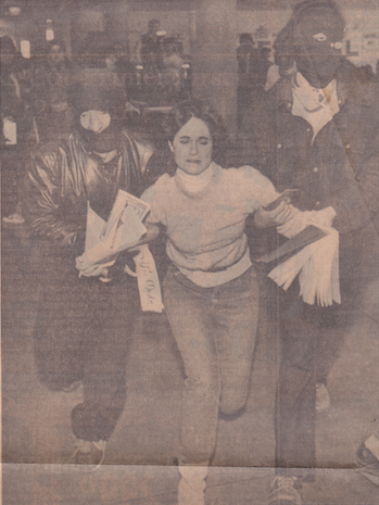 borrowed, grabbed the “victim”, shoved them into the van and tore off. The “troops” had cardboard weapons cut-outs of cardboard. After our kidnappings other members of our group passed out leaflets explaining the terror of living in El Salvador where kidnappings and disappearances occurred daily. Though we had alerted the Grand Rapids Police Department Community Affairs Unit in advance, they did not anticipate a problem until they got calls to 911 from people who thought the events were real. Afterwards we realized that one of us or others could have been killed. I personally regret that some were really frightened. Our message was pure but our delivery was not as well thought out.