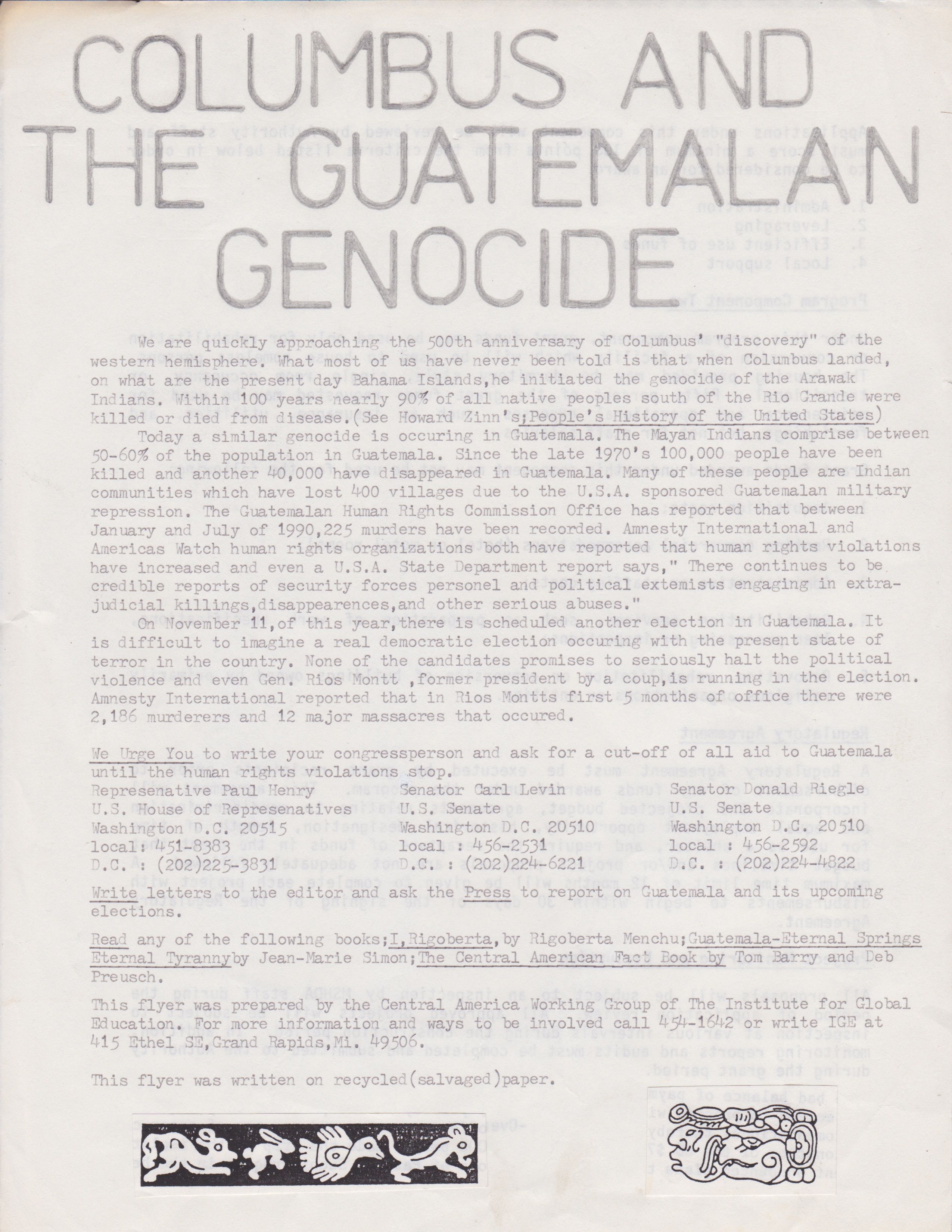 The flyer talks about the Columbian legacy and the genocidal policies in Guatemala during the 1980s. The flyer urges those who read it to become more informed and provided some resources to build awareness. In addition, there was a plea to contact members of Congress demanding they cut off all military aid to Guatemala, military aid that was essential to the Guatemalan counter-insurgency war that cost the lives of an estimated 200,000 civilians.