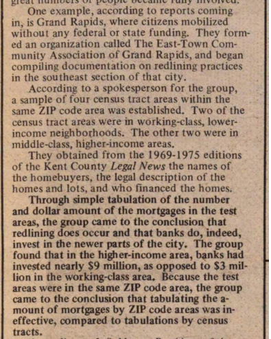 People have not sat by idly, while banks and other lending institutions have engaged in the racist practice of red lining. In an article from a July 15, 1976 article in the Ann Arbor Sun, Grand Rapids activists organized to investigate and challenge the practice of red lining. Here is the text from that article: