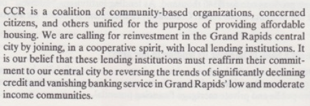 In 1991, a group calling themselves the Coalition for Community Reinvestment (CCR) produced a pamphlet that provides data on the practice of red lining in Grand Rapids, plus information and resources on how to fight red lining.