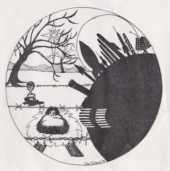 Jirous created political cartoons for a housing collective in Grand Rapids that produced its own newsletter called Koine Orama, which is Common Vision in Greek. Koine Orama was published by activists from a housing collective modeled after the Catholic Worker movement, so the content sometimes had overtly religious messages. In this first cartoon, Jirous uses the Christian Nativity scene, but instead of wise men and animals, you see military hardware and poverty reflected in the image.
