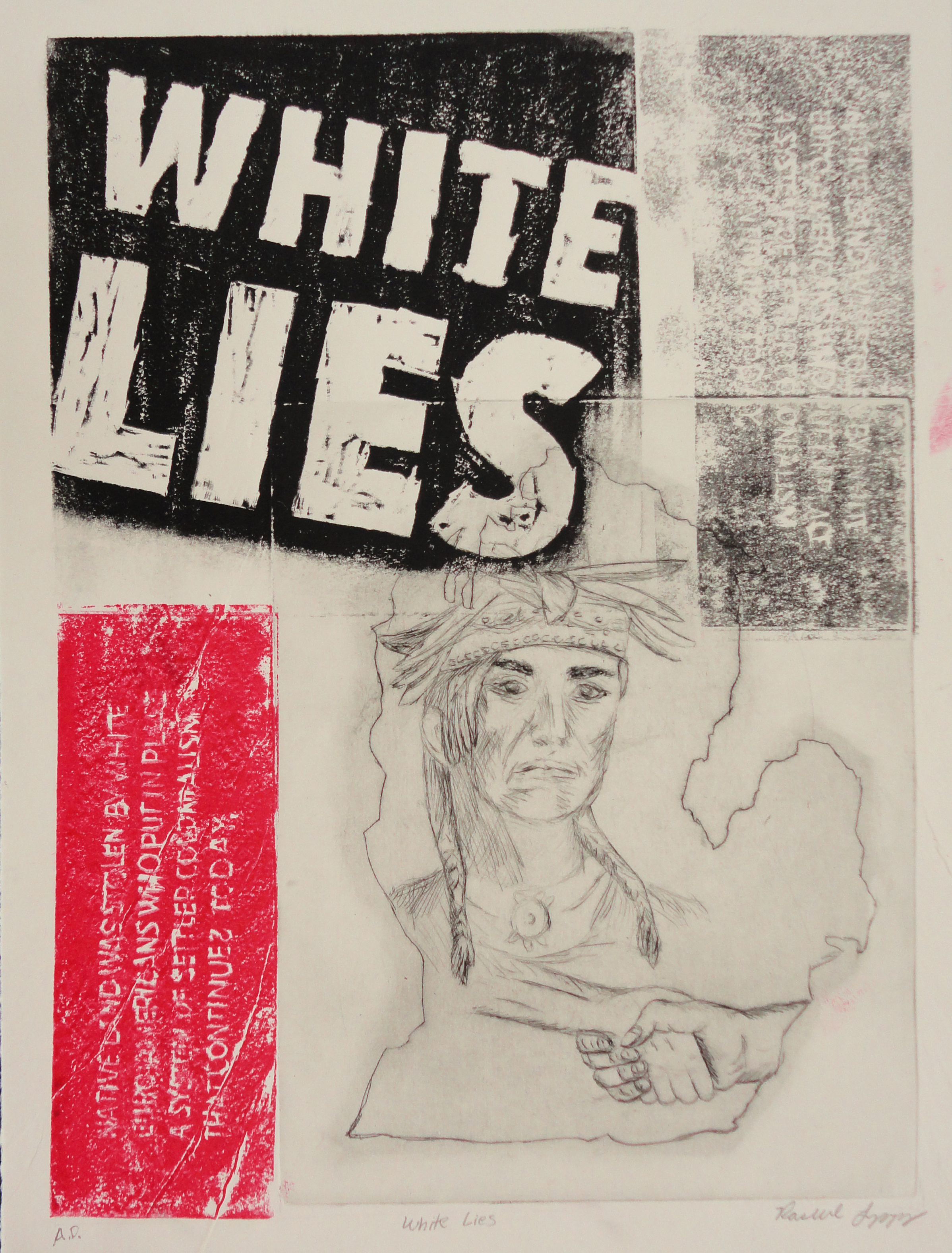 The second print we feature is from Rachel Szegedy. This print, entitled White Lies, highlights the reality of White Settler Colonialism that is the foundation of history in West Michigan since the 1820s. Szegedy’s print is based on the theme of White Lies and several of the articles from the Indigenous Resistance section, such as More White Lies: Grand Rapids and Settler Colonialism and The Role of Church & State in Native Displacement in West MI : Settler Colonialism in Grand Rapids Part II.