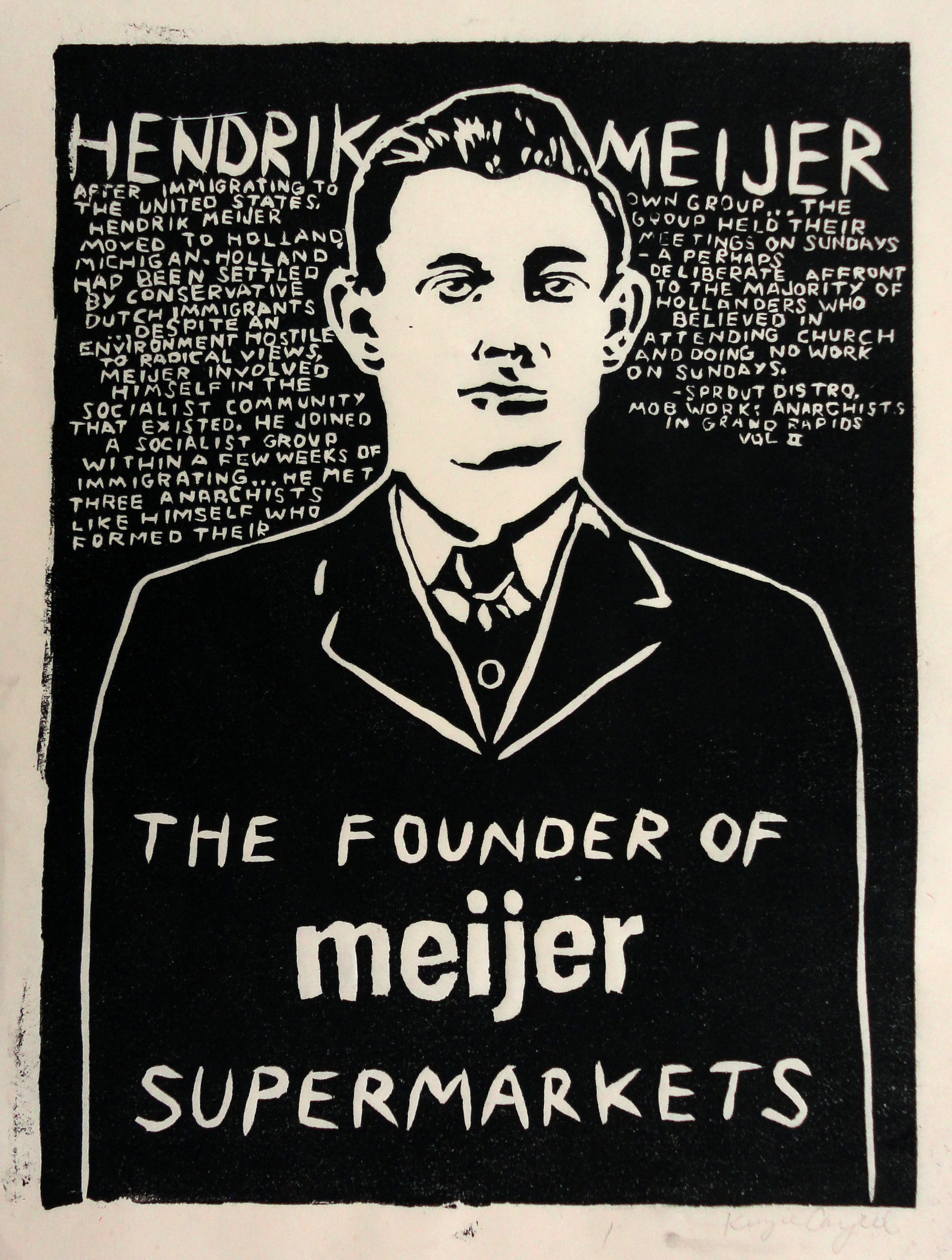 The fourth print we feature is from Kenzie Cargill. This print brings attention to the fact that for part of his life, the founder of Meijer stores, Hendrik Meijer, embraced Anarchism. The print by Cargill, was inspired by a zine created by Grand Rapids Anarchists distributed through Sprout Distro. Here is an excerpt from that zine on Hendrik Meijer: