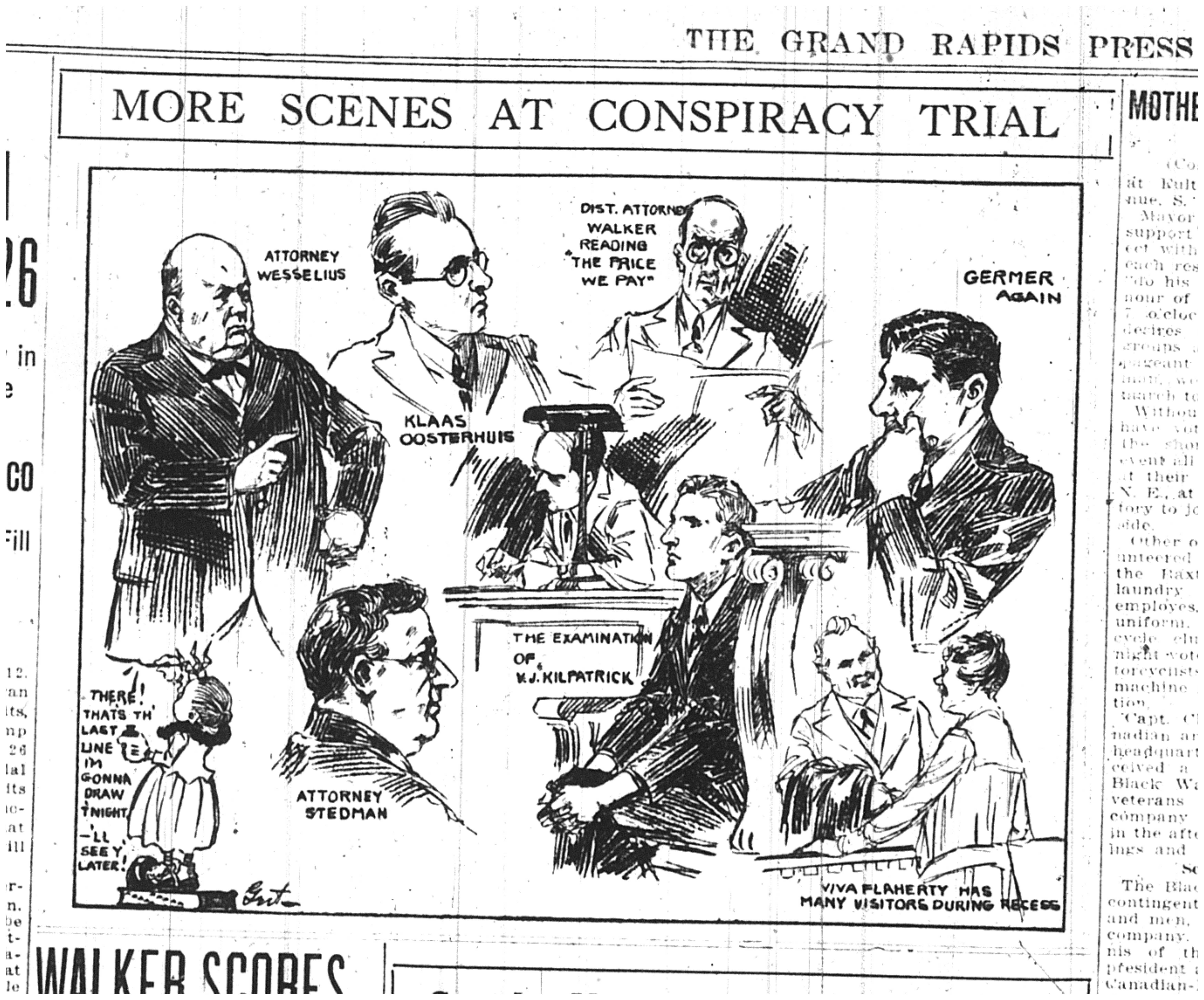 The Grand Rapids Press wrote about the arrests, the selection of the jury and the trial itself. Much of the their reporting reflected a bias in favor of prosecution of those arrested for distributing anti-conscription material. There were a few interesting cartoons that ran during the trial in October of 1917, one with the note below Viva Flaherty’s image which says, “Viva Flaherty has many visitors during recess.”