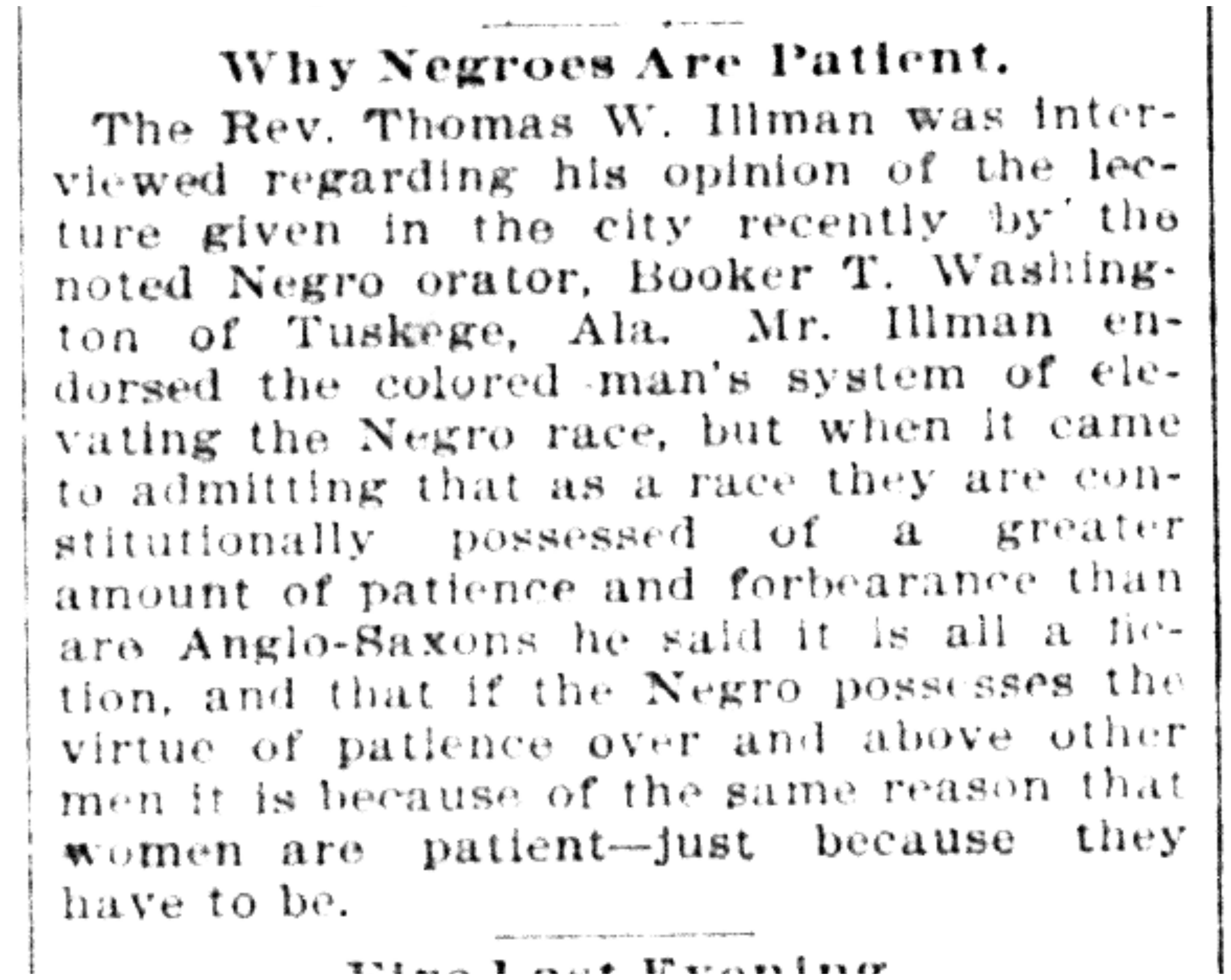 One follow up to this article appeared six days later, on January 30th, 1896. In that brief article (also in the Grand Rapids Democrat), Rev. Thomas Illman makes the following comments about the so-called patience of Negroes.