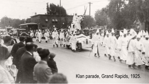 Related to the third tactic of using violence and intimidation, was the fact that in the mid 1920s the presence of the KKK was at an all time high in Grand Rapids. In the picture here below, one can see the number of KKK members boldly marching in a 4th of July parade in 1925. The Klan’s July 4 parade certainly sent a message to the Black community, which in the early 1920s numbered less than 3,000.