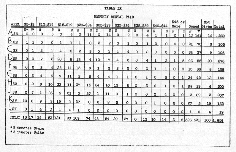 The study made some comparisons between white and black housing dynamics. White had a higher rate of home ownership, while black families had more people living in homes or apartments than their white counterparts. There is a difference in the condition of the homes, the size of the dwellings and the cost of rent for those who were not homeowners, as you can see from the chart below.