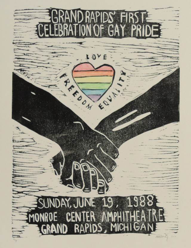The following print is from Michael Morey and celebrates the first Pride celebration in Grand Rapids in 1988. After activists from the LGBT community had traveled to DC to participate in a national march, they returned to Grand Rapids and created the first openly gay organization called The Network.