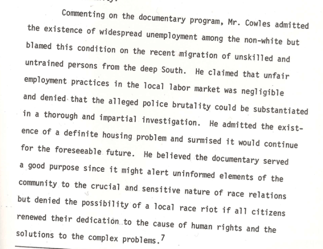 After the Watts riot in 1965, WOOD TV 8 produced an hour long documentary that mostly included interviews with the Black community and asking them if the conditions were similar in Grand Rapids as it was to Watts before the riot in Los Angeles. Those interviewed expressed complaints about housing, employment and police brutality, but Cowles generally refused to acknowledge these complaints. Here is what Cowles said after the 1965 WOOD TV 8 documentary: