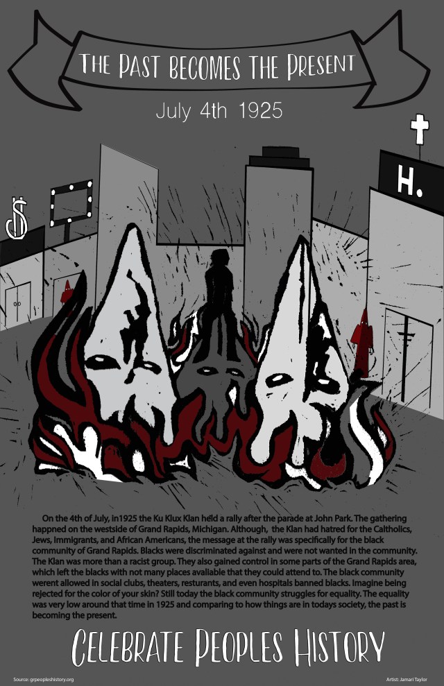 A new print by Jamari Taylor, depicts the blatant display of White Supremacy in Grand Rapids in 1925, when the KKK organized a parade on the city’s westside.