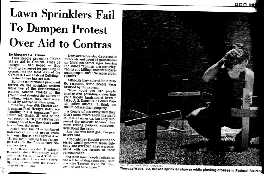 The article below, which is from the Grand Rapids Press (June 26, 1986) involved several members of the Koinonia House, who placed crosses in the law of the federal building, with names of Nicaraguan civilians, as a way to draw attention to the US-back Contra War in that Central American Country.
