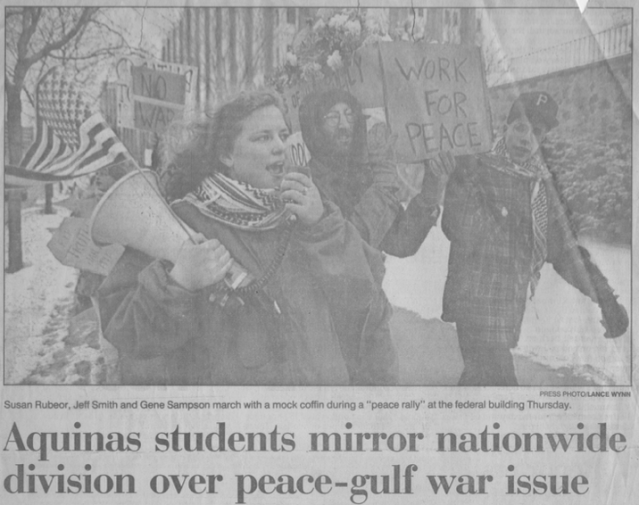 Activists in Grand Rapids began holding weekly demonstrations in front of the federal building in downtown, sometime in September of 1990. The weekly demonstrations grew in size between September and the New Year, as the Bush Administration began to ramp up campaign to justify an invasion of Iraq.