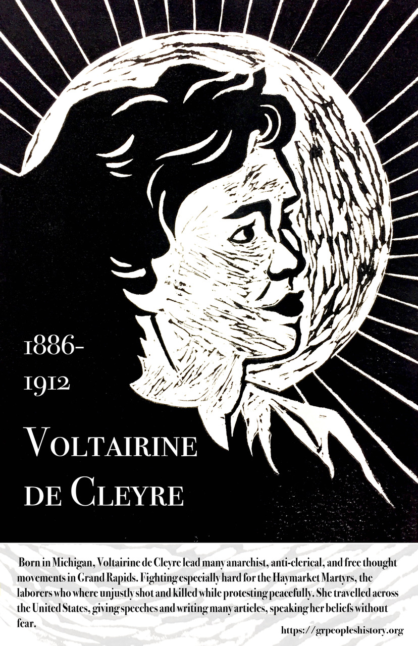 This new print, created by GVSU student Katie Los, celebrates the life of American anarchist Voltairine De Cleyre.
