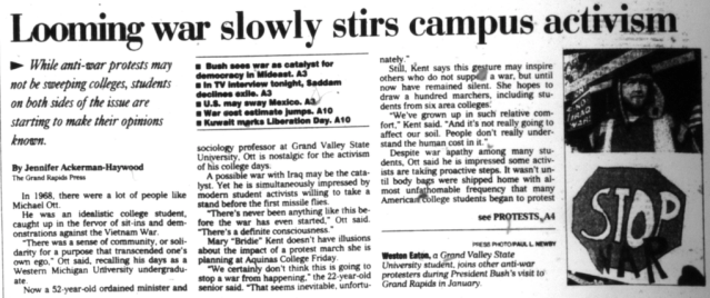 Beginning in the fall of 2002, college students in the greater Grand Rapids area began to be involved with anti-war organizing efforts. Some of those students were part of the People’s Alliance for Justice & Change, but most of them were organizing on their campus. The above article from the Grand Rapids Press attempted to show that college students were becoming active, but the main problem with the article was that they were n’t really talking to students who were actively involved in resisting the US invasion of Iraq.