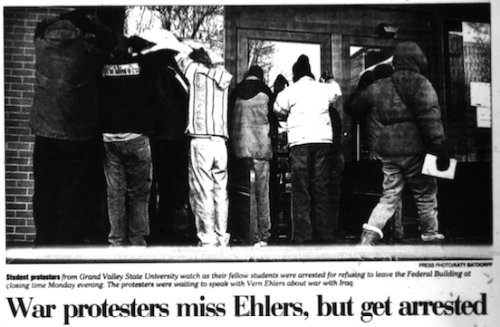 In today’s post we want to look at what college students were doing to respond to a build up to the US invasion of Iraq, along with an action that took place against Congressman Vern Ehlers support for the US invasion that took place prior to the March 20, 2003 US assault on Iraq.