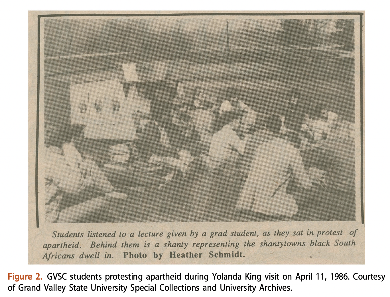 “The history of the anti-apartheid movement at Michigan’s flagship universities— Michigan State University (MSU) in East Lansing and the University of Michigan (UM) in Ann Arbor—is well-known. Also somewhat well-documented are events at Western Michigan University (WMU) in Kalamazoo, which was the second institute of higher learning in Michigan to fully divest from South Africa, after MSU. Yet the anti-apartheid movement in the state’s western colleges and universities outside of Kalamazoo remains largely undocumented. Drawing on a small selection of archival documents, this essay explores the history of the anti-apartheid movement at Grand Valley State College (GVSC, now Grand Valley State University) in West Michigan, a region presently most well known for its conservative political climate. The micro-history that emerges from these documents is that of a campus movement that emerged relatively late compared to others, but which burned brightly in the context of major structural changes taking place at the college.”
