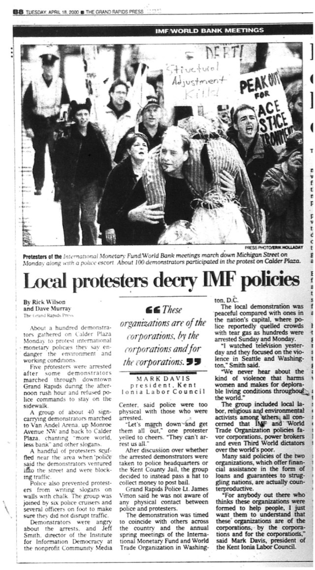 After Seattle, these kinds of mass demonstrations began to follow the WTO, the IMF, the World Bank and any regional trade policy discussions. In the Spring of 2000, there was an action planned in Washington DC, while local groups were also planning their own actions. In Grand Rapids, an anti-globalization movement also planned an action that would coincide with what was happening in DC.