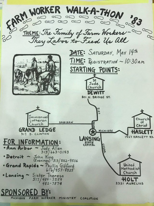 At the end of the archived document above, it says that there was going to be a meeting at Sr. Joseph the Worker Catholic Church, in preparation for the Migrant Worker Walkathon being held in Detroit in May of 1978. We did not find anything on the Walkathon for 1978, but we did find an archival flyer for a Walkathon in 1983, picture below.